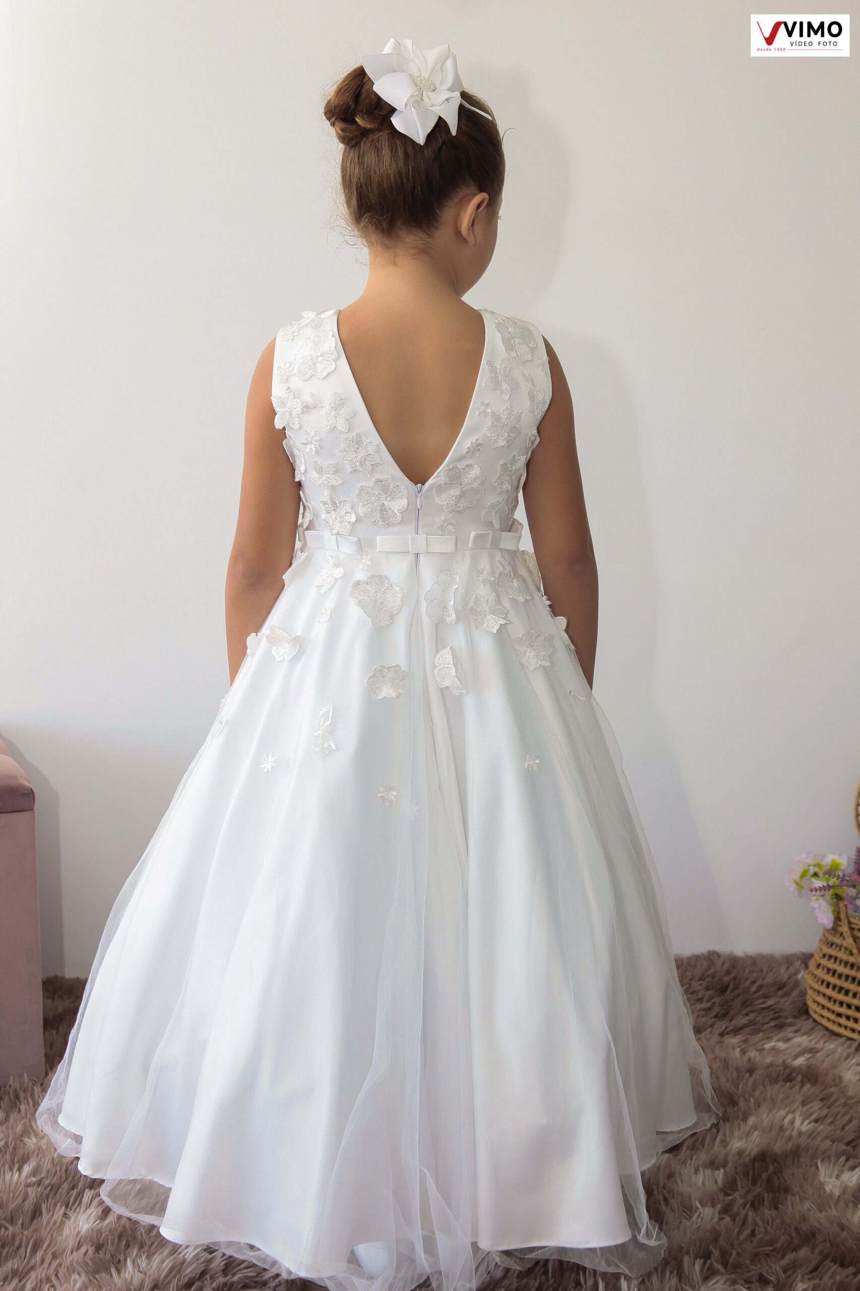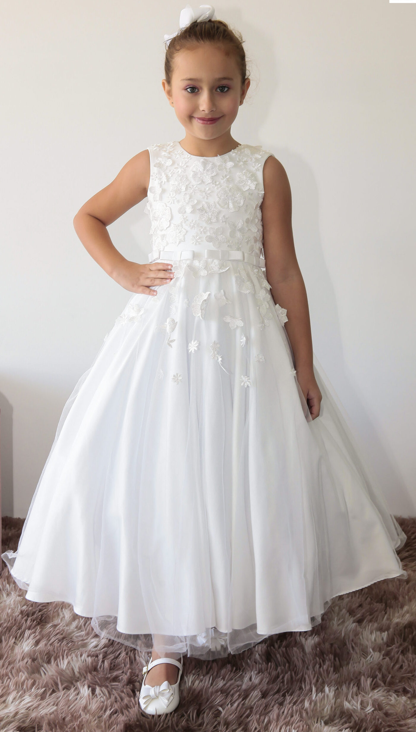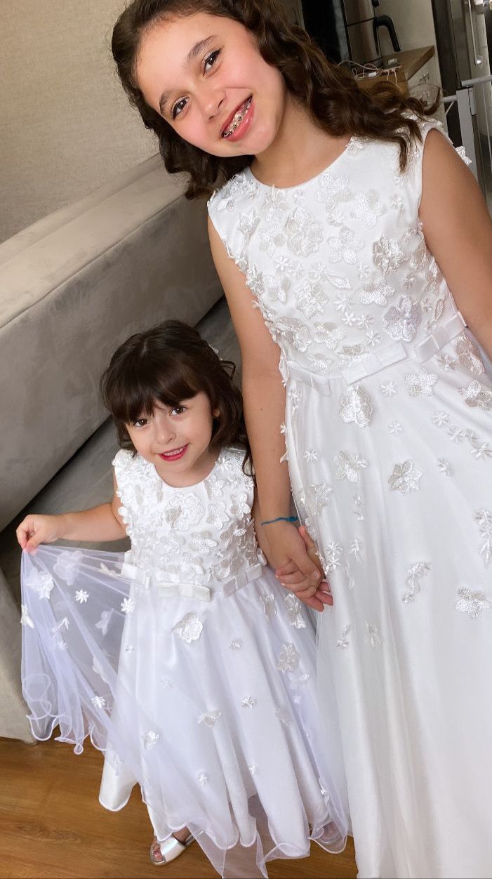 Lindo modelo com aplicação de flores em relevo no corpete, descendo para a saia.
