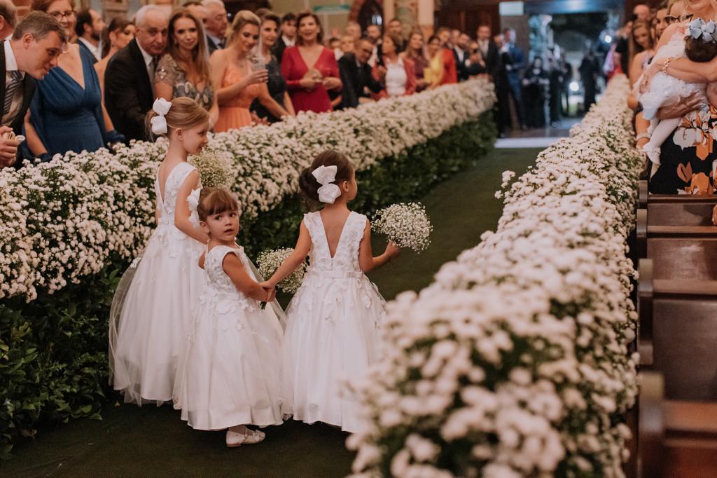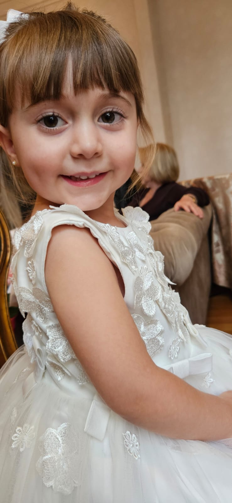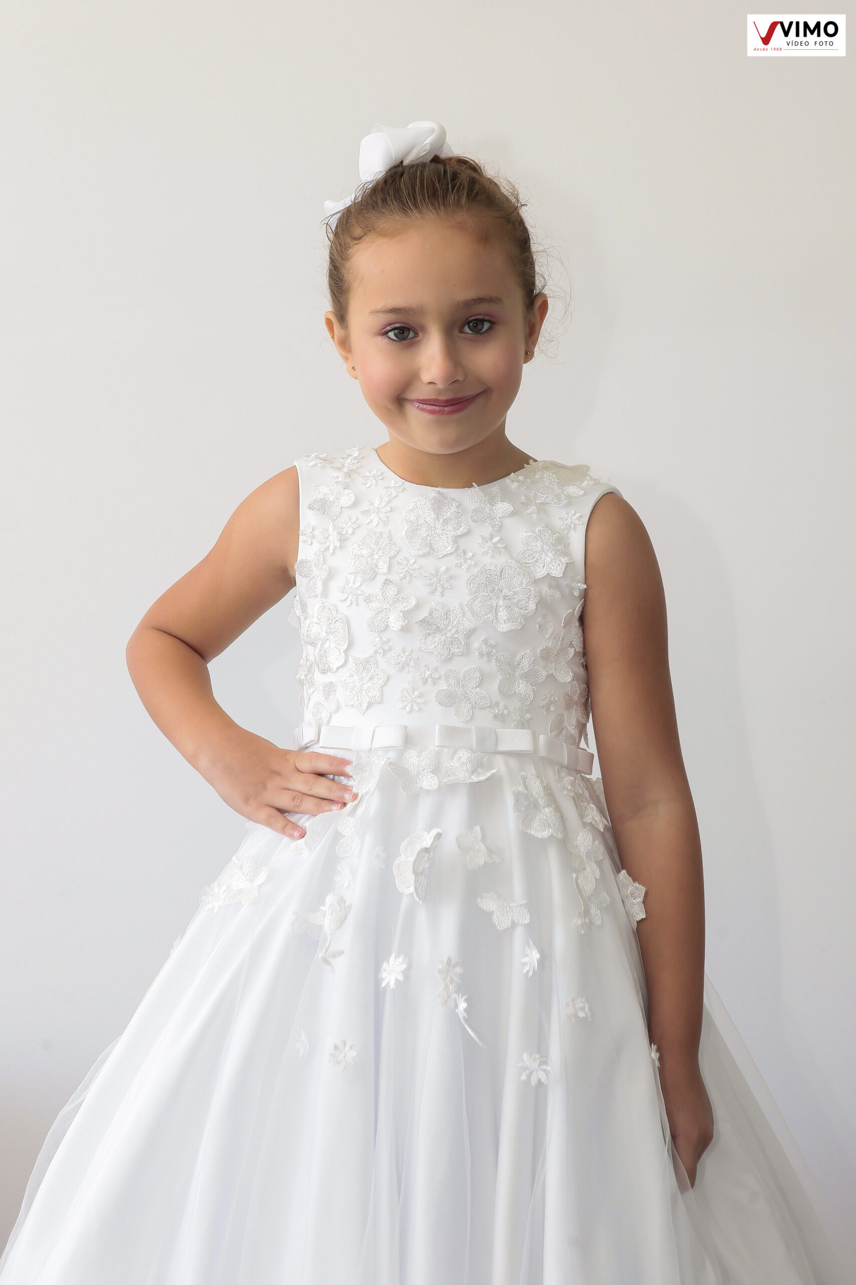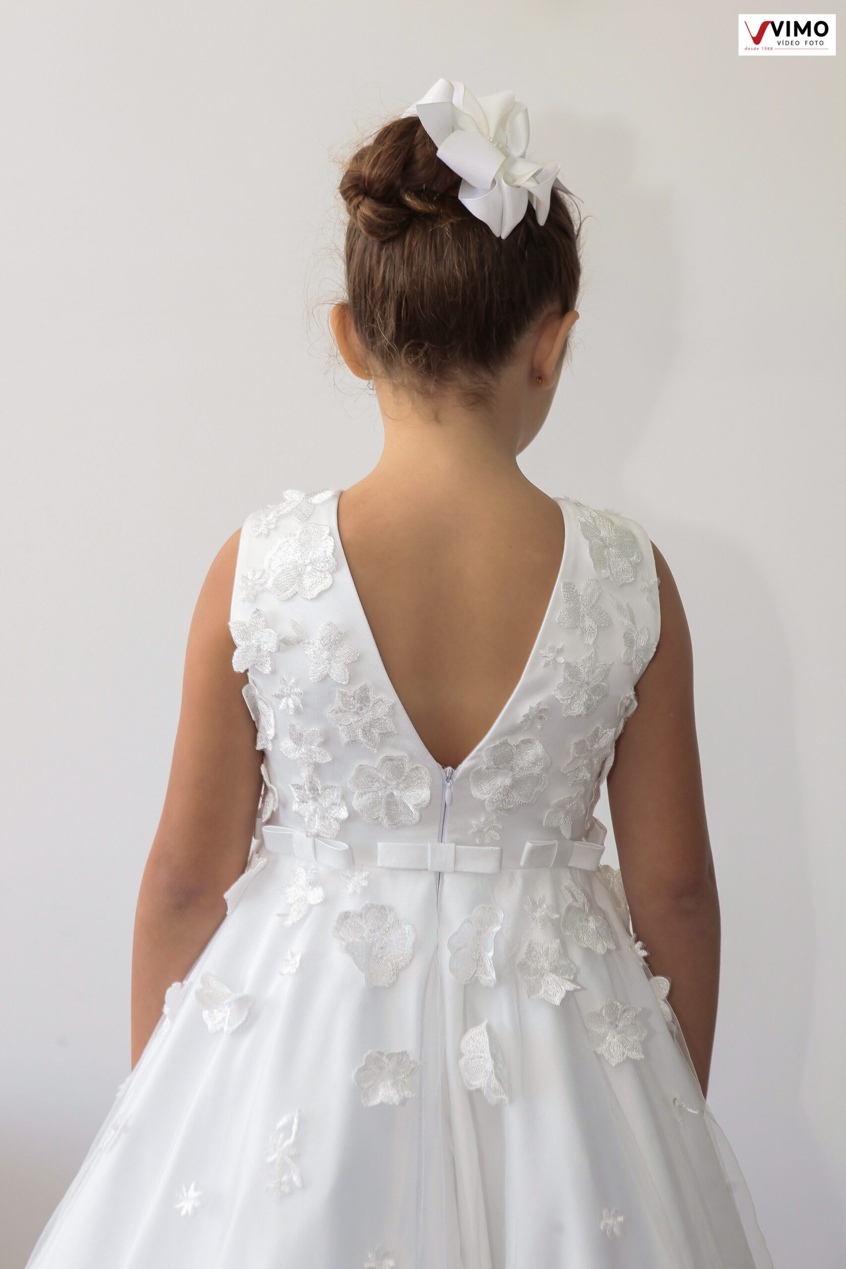 Lindo modelo com aplicação de flores em relevo no corpete, descendo para a saia.
