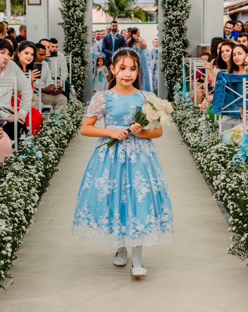 Vestido confecção própria em cetim noiva azul celeste com sobreposição de renda branca, um encanto!