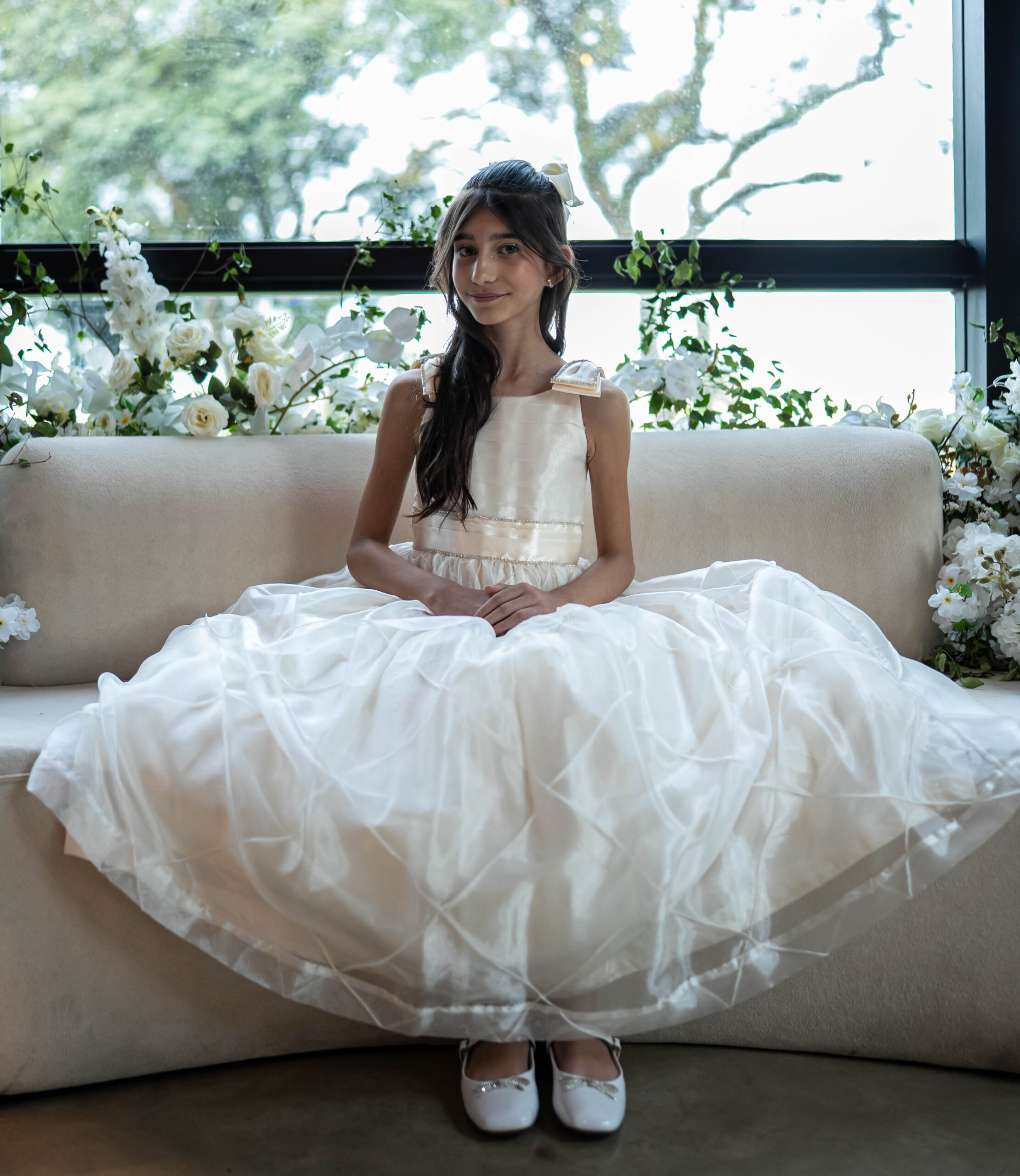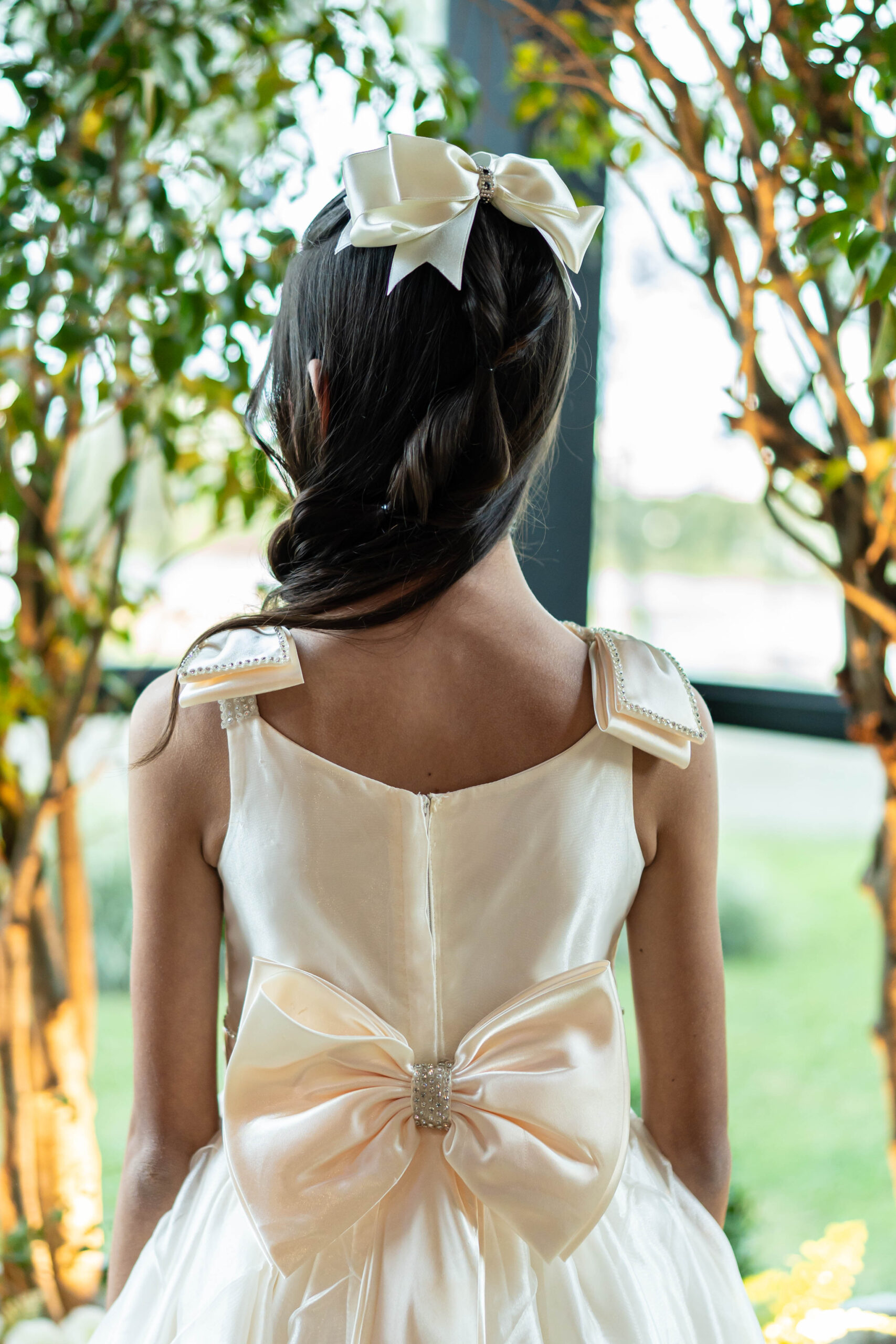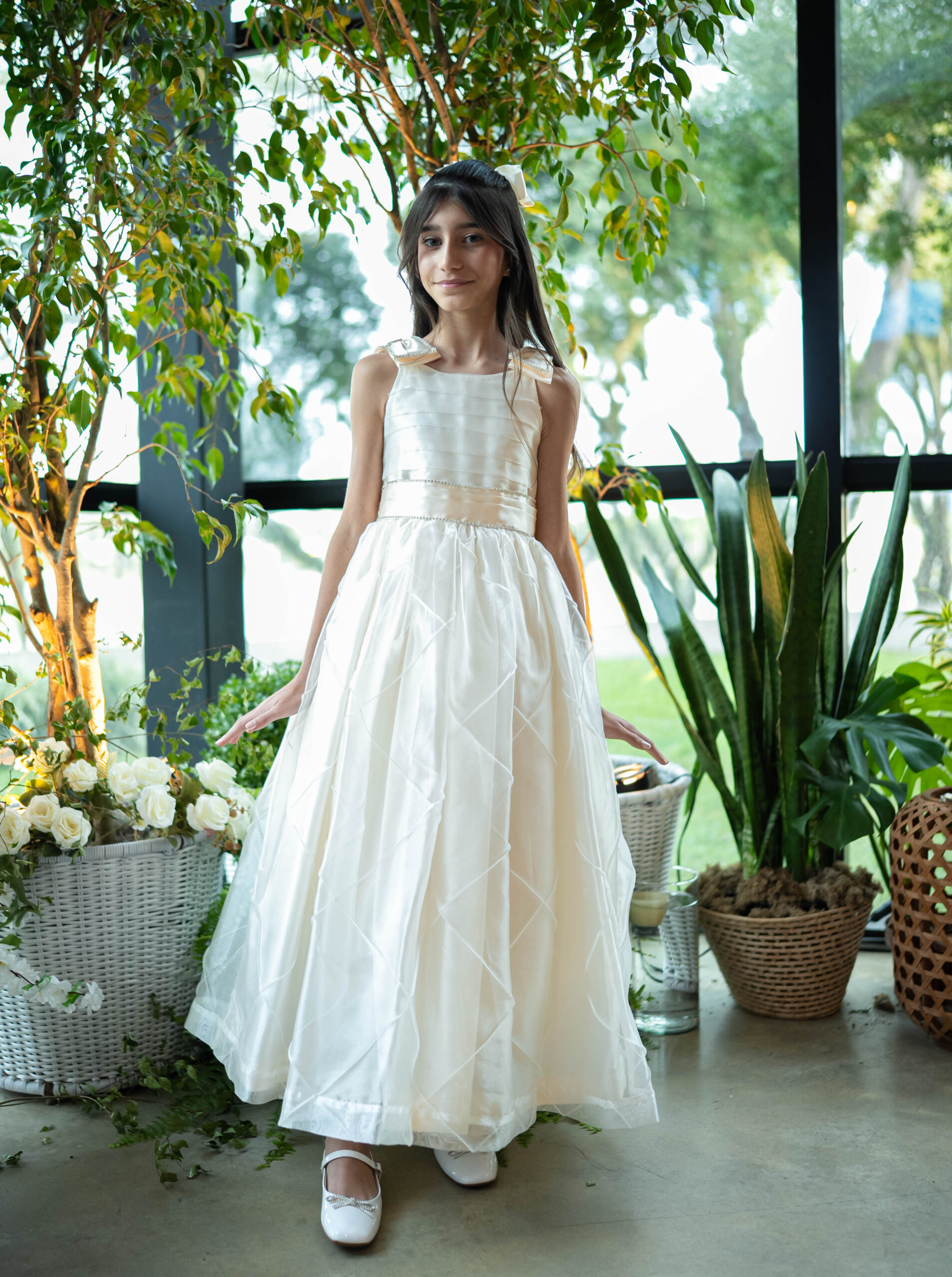 Confeccionado em organza cristal off-white, com lindo detalhe de nesgas na saia, único e estiloso.