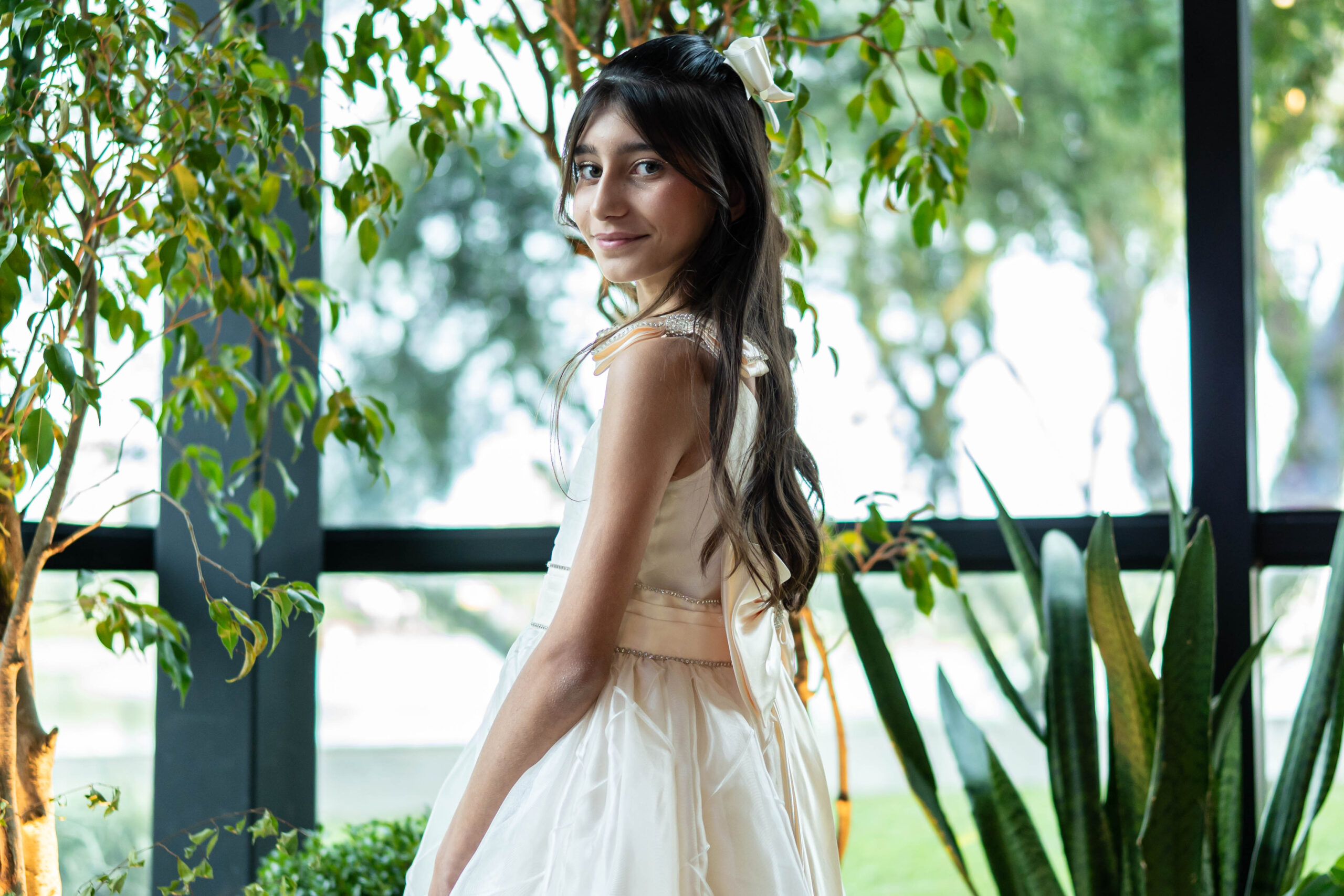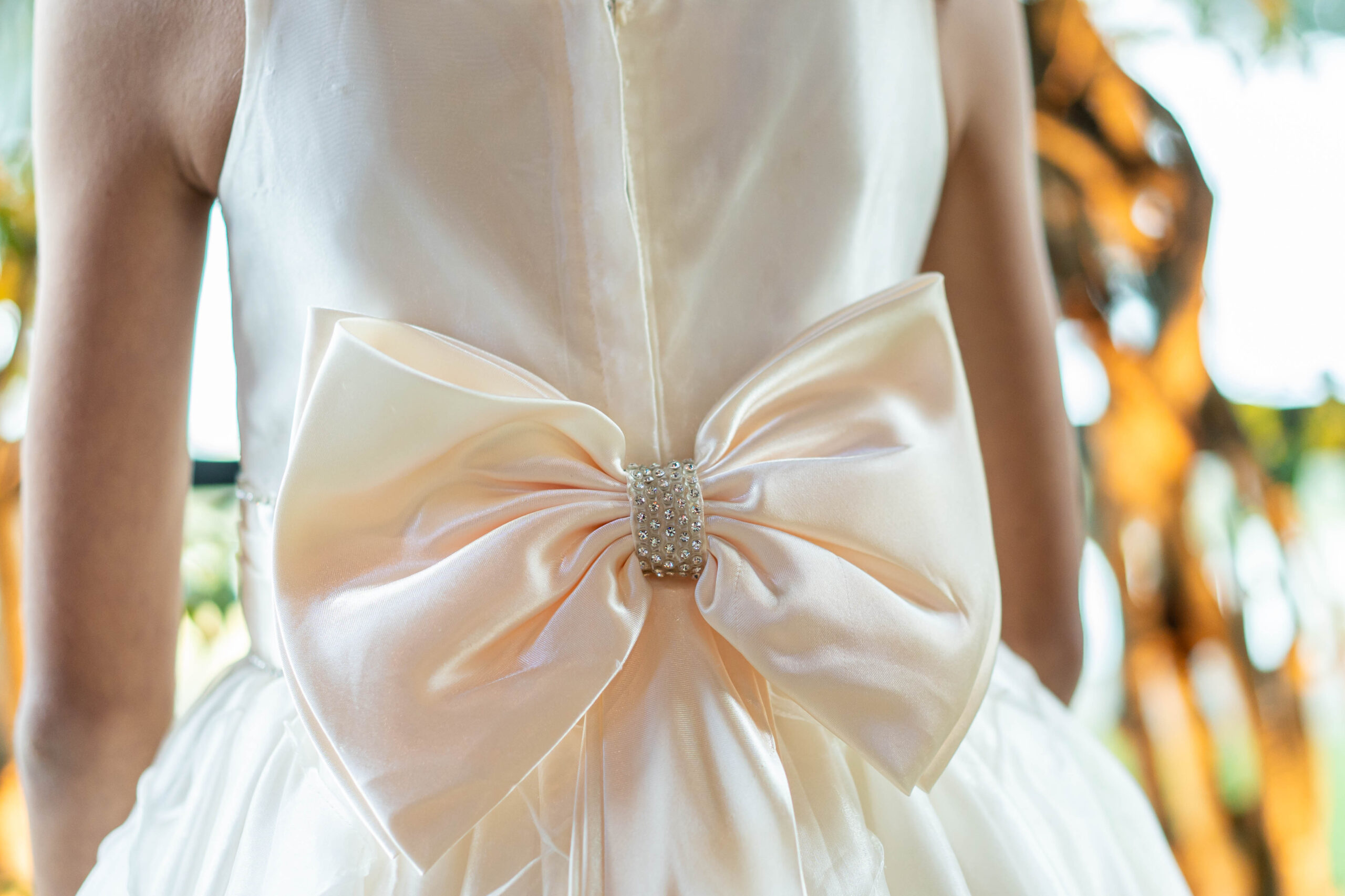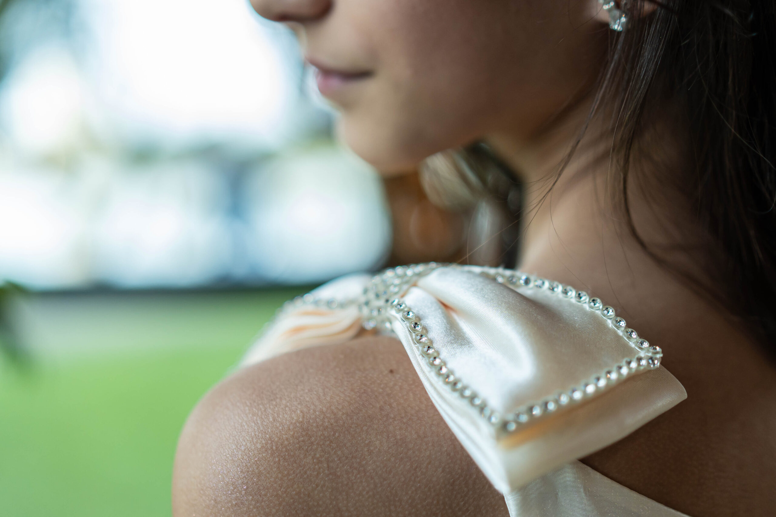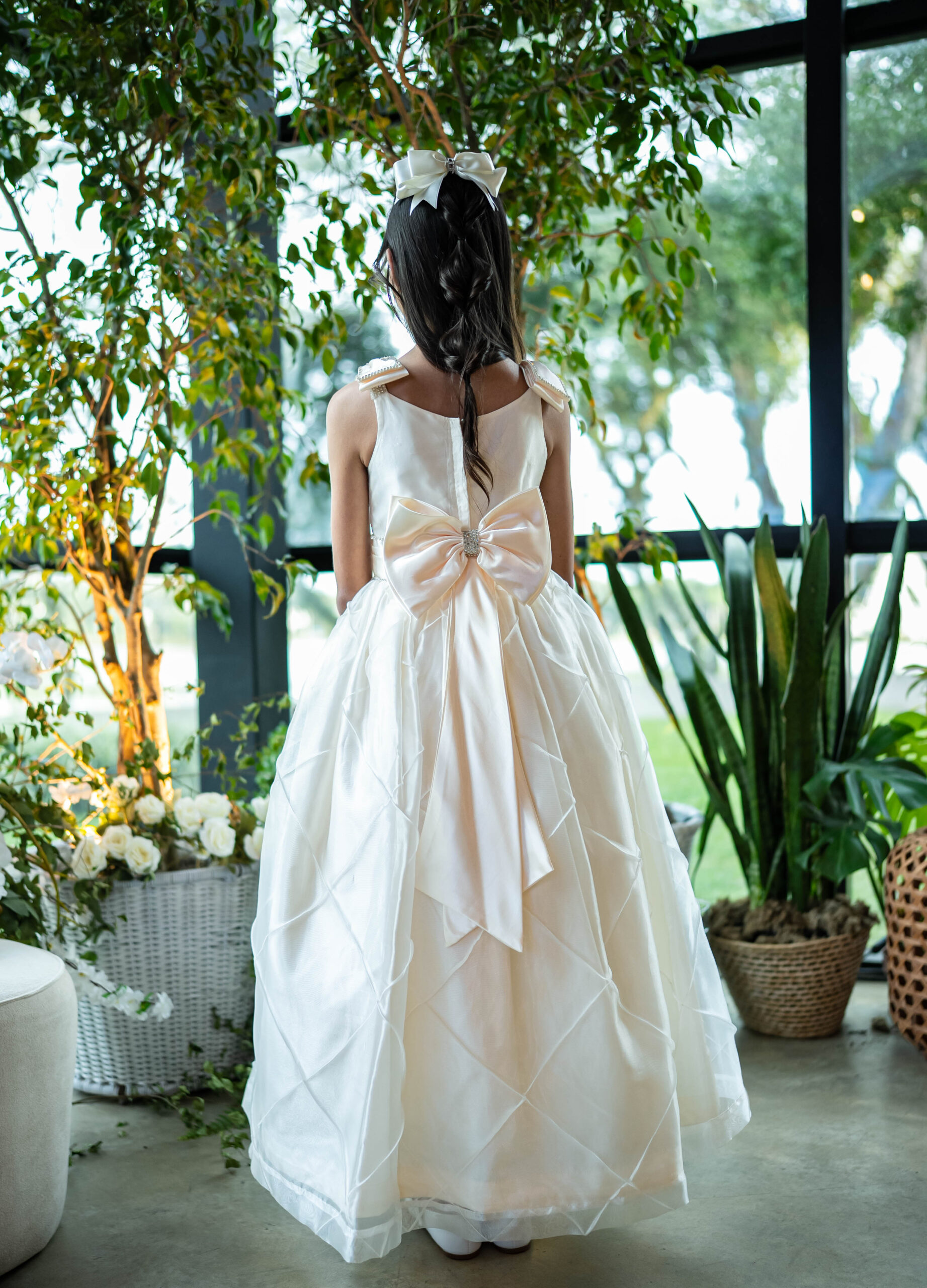 Confeccionado em organza cristal off-white, com lindo detalhe de nesgas na saia, único e estiloso.